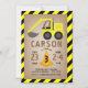 Gelber Bagger und orangefarbener Konstruktionskegel mit gelb-schwarz gestreiftem Hintergrund.