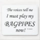 Die Stimmen sagen mir, dass ich jetzt meine Bagpipe spielen muss! Haben Sie Stimmen in Ihrem Kopf, die Ihnen sagen, Ihr Instrument zu üben, oder dass Sie spielen müssen? Die Stimmen können von Ihrem Lehrer oder Regisseur oder von Ihnen selbst kommen und Ihnen mitteilen, dass Sie üben müssen, um all das Talent, das Sie haben, herauszubringen!