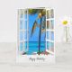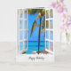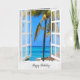 Das offene Fenster und die Vorhänge zeigen auf die Szene des Strandes von Bahama.
