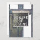 Ein Kunstentwurf der alten Tür des Buchungsbüros auf dem Bahnhofsbahnhof mit einer Warnung vor einem Einlass und Vorsicht vor den Zügen aus der Zeit des Dampfzugs.