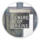 Ein Kunstentwurf der alten Tür des Buchungsbüros auf dem Bahnhofsbahnhof mit einer Warnung vor einem Einlass und Vorsicht vor den Zügen aus der Zeit des Dampfzugs.