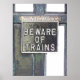 Ein Kunstentwurf der alten Tür des Buchungsbüros auf dem Bahnhofsbahnhof mit einer Warnung vor einem Einlass und Vorsicht vor den Zügen aus der Zeit des Dampfzugs.