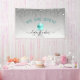 Let customers know your bakery or cake decorating shop is open for business with this elegant banner, featuring a turquoise and silver wedding cake illustration on a silver ombre background, with a top border of silver dripping faux glitter. The words "WE ARE OPEN!" (or text of your choice) arch above the cake in large turquoise sans serif font. Customize the sign with your business name in black handwriting script with swashes at the beginning and end, and your contact information or tag line in black sans serif font. (To keep the swashes, replace only the letters in those text fields, leaving the symbols in place.)