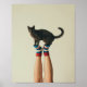 Eine schwarze Katze balanciert anmutig auf einem Paar farbenfroh gestreifter Socken, die durch ein Paar Beine erhöht werden. Der Hintergrund ist eine einfache, helle Farbe, die die skurrile Szene hervorhebt.