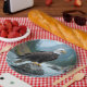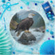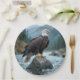 Ein majestätischer Glatzenadler liegt auf einem Felsen inmitten eines fließenden Flusses, gerahmt von einer scheußlichen Bergkulisse und dichten immergrünen Bäumen