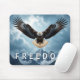 Ein Glatzenadler mit ausgestreckten Flügeln fliegt anmutig über eine Reihe schneebedeckter Berge mit FREEDOM-Text. Text ist bearbeitbar.