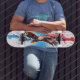 Bald Eagle Fliegt über einen Hauch von rot, weiß u Skateboard