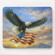 A majestic bald eagle soars through a vibrant sky, clutching an American flag in its talons, with mountains and colorful clouds providing a stunning backdrop