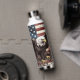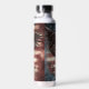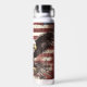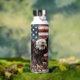 Auf dieser patriotischen Getränkeflasche ist ein erbitterter Glatzadler Set zu Land, mit ausgestreckten Flügeln und Klauen. Im Hintergrund ist eine Not leidende US-Flagge.