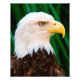Die weißen Kopffedern eines Bald-Adlers stehen im Kontrast zu einem grünen Hintergrund. Er ist scharf und spitz. Seine Augen konzentrieren sich auf etwas in der Ferne.