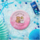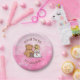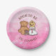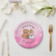 Land und Western Thema rustikale Mädchen's Baby-Dusche Papier Teller. Grafik ist ein niedliches kleines Mädchen in einem Cowboy, der neben einem Teddybär sitzt. Rosa Hintergrund. Baby Shower Papier Teller.