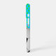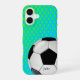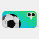 Benutzerdefinierte Fußball-Fan iPhone Gehäuse, mit Grafiken eines blauen und grünen Punktmuster Hintergrund. Die Grafik einer Fußballkugel schmückt die untere rechte Ecke des Gehäuses, und der schwarze Text am unteren Rand ist personalisiert. Großartiger Telefonkasten für Sportfans oder Fußballspieler.