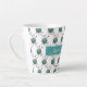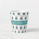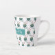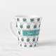 Garne und Nadeln schneiden Tasse mit Ort, um mit einem Namen zu personalisieren. Beispieltext ist "{Name} strickende Tasse" in weißer Schrift über blaugrün-blaugrüne Farbtafel in der Mitte einer weißen Tasse. Zwei Stricknadeln, die in einer Kugel aus verschiedenen blauen Garnen stecken, machen die kleine Tasse für Kaffee oder Tee zum Spaß.