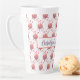 Garne und Nadeln knetend große latte Tasse mit Platz zum Personalisieren mit einem Namen oder kurzen Sprichwort. Rosa und lila Farben. Beispieltext ist "{Name's} strickende Geister" in lila Schrift im Zentrum einer weißen Tasse. Zwei Stricknadeln, die in eine Kiste aus verschiedensten Garnen stecken, machen eine große oder kurze Tasse zum Spaß.