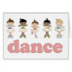 Fünf bezaubernde Ballerinas tanzen auf diesem Design, mit Kostümen und Schuhen geschmückt. Rosa "Tanz" Wort unter ihnen.