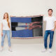 Ballett-Tanzfuß mit rosa Schuhen an einer Tanzfläche und blaue Mauer mit Musiknoten. Werfen Sie Decke.