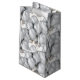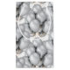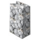 Die Geschenktasche aus Papier wird in weißer Farbe mit glänzender Oberfläche mit festlich silberfarbenem Ballondruck gezeigt. Kleine Größe angezeigt Diese Geschenktasche anpassen oder kaufen, wie es ist.