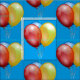 Ein Stoffdesign mit einem Haufen roter blauer und gelber Ballons an einem individuell anpassbaren himmelblauen Hintergrund. Ideal für Mädchen / Kinderbekleidung. Niedliches skurriles Vintages Design.