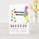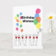 Netball Grußkartenvorlage mit Ballons und Strichmännchen. Benutzerdefinierte Geburtstagskarte für Netballspieler oder Fan.