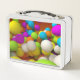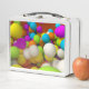 Diese Lunchbox hat bunte Kugeln, die darauf abgebildet sind.