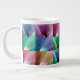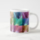 Das Originalmuster von ZoeSPEAK auf dieser Jumbo-Tasse entstand aus Originalfotos von Bananen-Blätter auf einem Baum im Garten. Die Fotos sind Verschlüsse, die die gerippten Muster der Blätter zeigen, während sie sich im Sonnenlicht umkreisen. Die Fotos wurden mit verschiedenen Farbtönen getönt, schiere Grüntöne, Blues, Braun und Püree. Die Nähte, an denen sich die Fotos treffen, haben leicht gewölbte Kanten, als ob sie wie ein Steppchen zusammengenäht wären.
