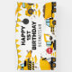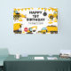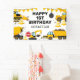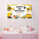 Banner zum Thema Geburtstag mit einem einfachen, weißen Hintergrund, mit niedlichen Cartoon-Illustrationen von Bunding, Stoppschildern, einem Müllwagen, einem Bagger, einem Zementwagen, einem Kranich, Spritzern von Schmutz, und einer glücklichen Geburtstagsvorlage, die leicht zu personalisieren ist.