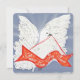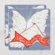 Eine Taube, gegossen, leuchtende Sternenstrahlen, mit hochgehobenen Flügeln, trägt ein leuchtend rotes Banner, in ihrem Schnabel, mit den Worten "Friede, Liebe, Freude" versehen, hervorgehoben mit glänzenden Sternen.