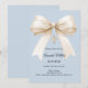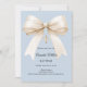 Celebrate his special day with this elegant dusty blue baptism invitation featuring a soft ivory satin bow and delicate gold cross detail.