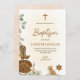 "Baptism invitation card with a rustic theme, featuring a cross, leaves, and vintage elements like a wooden carriage wheel. Neutral tones convey a serene and heartfelt atmosphere."