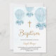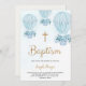 Baptism invitation with blue hot air balloons and gold cross. Features elegant script text announcing a ceremony, set on a light marble background.