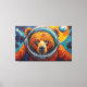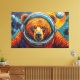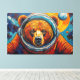Dieses auffallende Kunstwerk von Otis Porritt zeigt einen majestätischen Bären, dessen Gesicht von dem klaren Visier eines Astronautenhelms eingerahmt wird. Reiche, texturierte Pinselstriche in warmen Oranges, Rots und Bräunentönen definieren das Fell des Bären und kontrastieren scharf mit den kühlen, wirbelnden Blautönen und Purpurfarben des kosmischen Hintergrunds. Planeten und entfernte Sterne durchsetzen den lebendigen Raum, der mit dynamischen, impastoartigen Effekten dargestellt wird. Der direkte Blick des Bären verankert die Komposition und schafft eine kraftvolle und einnehmende visuelle Erzählung innerhalb dieser fantastischen himmlischen Kulisse.