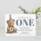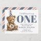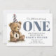 Unser kleiner Bärenkub verwandelt eine erste Einladung zum Geburtstag eines Babys. Braune und staubige blaue Farben. Bären Sie im Party mit Holz mit Nummer eins! Hübsche, weiche Wasserfarben, die für geschlechtsneutral sind, laden Jungen und Mädchen gleichermaßen ein. Die Rückseite hat diagonale Streifen in Rosa und Blau. Moderne rustikale Waldtierart. Whimsical und niedlich.