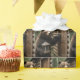 Ein Bär klopft an einer Blockhütte in einem Wald und hält einen leeren Vogelfeder