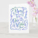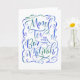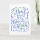 Eine magische Tov-Karte für eine Bar mitzvah, handbuchstabiert in Aquarell in Blues und Grüntöne.