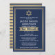 Laden Sie Familie und Freunde zu einer eleganten Bar mitzvah Zeremonie und Feier für ihn mit dieser Marineblau, Weiß und Imitat Goldfolie Einladung. Der gesamte Text ist einfach zu verändern, sodass er jeden beliebigen Wortlaut in Bezug auf den Dienst, die Tora-Lektüre und das Party enthalten kann. Das Design besticht durch einen goldmetallischen Look Star of David, stilvolle Kunst Deko inspiriert Typografie und moderne Skriptkalligraphie. Mazel Tov!