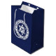 Bar mitzvah Geschenktaschen mit einem weißen Stern von David mit dem Monogramm-Initial des Jungen, und Name und Datum um den Stern herum. Die Standardfarben sind weiß und dunkelblau, aber alle Farben sind im Designwerkzeug vollständig anpassbar.