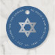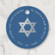 Das Design hat in seiner Mitte einen falschen goldenen Davidstern. Um ihn herum befindet sich gebogener Text in silbergrauen Großbuchstaben: darüber eine Dankesbotschaft mit dem Namen und dem Anlass: "Danke, dass Sie zu [Name]s Bar Mitzwa gekommen sind", darunter das Datum. Der Hintergrund ist klassisch blau.