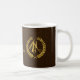 Luxuriöse exklusive Tasse für einen Friseurhairstylist in Imitat Gold auf einem dunkelbraunen Lederhintergrund. Bitte beachten Sie, dass das Leder- und das Gold-Look gedruckt sind.