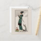 Eine Postkarte mit dem Vintagen französischen Modeschild aus dem Jahr 1914, Tailleur de Ratine Verte et Veloure Noir, illustriert von George Barbier. Diese Abbildung zeigt eine Frau in einem grünen Anzug mit schwarzem Samt, roten Blume und einem kleinen schwarzen Hund.