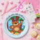 Ein schöner Bär, der in einer grünen Wiese in der Mitte eines runden Tellers ruht. Oben und unten definieren Texte, wessen Geburtstag es ist, wie alt er ist und wann das Fest stattfindet. ( Diese Nachrichten könnten durch Ihre Lieblingsbotschaften wie "Happy Geburtday" ersetzt werden, wenn Sie es vorziehen.