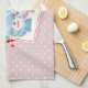 Ein Küchentuch mit einem niedlichen Cartoon von einem Bärenpaar, ein Bär ist pastellrosa mit einem kleinen Bogen und küsst die Wange eines blauen Bären, der sehr erfreut aussieht. Sehr niedlich und Kawaii. Viele rote Herzen schweben herum. Rosa Hintergrundfarbe mit weißem Polka Punkt Muster.