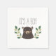 Woodland thematisierte Babydesign von Shelby Allison mit einer Illustration von skurrilen grünen Blumendesigns, die ein süßes Bärenkuppportrait mit den Worten "es ist ein Junge" umgeben.