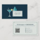 Eine Visitenkarte mit einer Abbildung eines Cocktail-Shakers und eines Martini-Glases auf dunkelblauem Hintergrund. Ideal für einen Barkeeper, ein Pub, einen Mixologen oder einen Party-Barkeeper. Auf der Rückseite finden Sie vollständige, anpassbare Informationen und einen QR-Code.