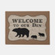 Dieses ist eine niedliche Türmatte, die für ein Kabinen- oder WaldZuhause perfekt ist. Es kennzeichnet eine hölzerne Kornfahne des Imitats mit einem schwarzen Mutterbären und zwei Jungen. Der Text über den Bärnbildern sagt "Willkommen zu unserer Höhle". Die Fahne wird auf einen Braunhintergrund des festen Mediums gesetzt.