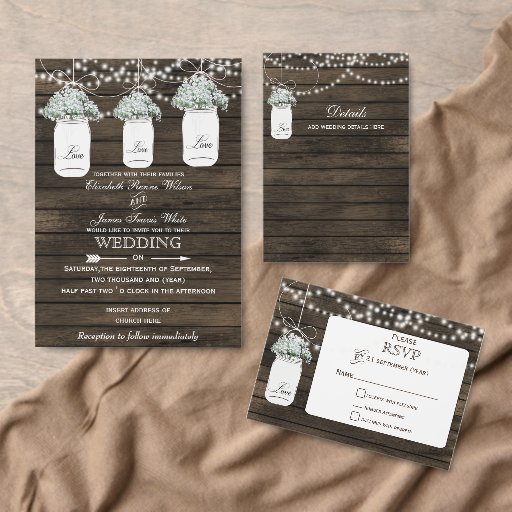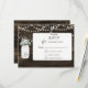 Rustikales Barnwood, danglende Saitenleuchten mit dem Atem des Babys in einem Mason Glas Hochzeit RSVP. Auch passende Produkte sind erhältlich.