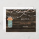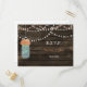 Rustikales Barnwood, dangling Saitenleuchten mit Korallen Blume in einem Mason Glas Hochzeit RSVP Postkarten. Auch passende Produkte sind erhältlich.