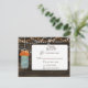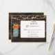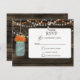 Rustikales Barnwood, verwinkelte Saitenleuchten mit orangefarbenen Blume in einem Maurerkrug Hochzeit RSVP. Auch passende Produkte sind erhältlich.