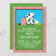 Diese niedliche Geburtstag-Party Einladung verfügt über eine Barnyard-Szene mit Nutztieren auf einem karierten Tischboden. Vollständig anpassbar.