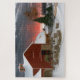 Horatio Shaw. Schafe und Hühner in einer schneebedeckten Scheune vor einer roten Scheune und einem strahlenden Himmel.