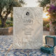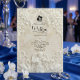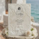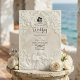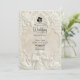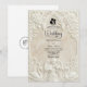 Verkünden Sie Ihre Verbindung mit der zeitlosen Größe der Kunst des 17. Jahrhunderts. Dieses Design beschwört die Romantik einer europäischen Kathedrale herauf, perfekt für traditionelle Paare. Dieses Design verfügt über einen raffinierten Faux-Basrelief-Effekt, der das Aussehen von geschnitztem antiken Stein in einer monochromen Palette aus warmem Creme, Elfenbein und Beige simuliert. Die Komposition wird von einem klassischen architektonischen Bogen gerahmt, der mit aufwendigem Akanthus-Ornament und Rosen verziert ist. Am Kopfteil zeigt eine zarte Illustration einen barocken Engel, der Violine spielt, flankiert von zwei grazilen Schwänen, die einander zugewandt sind und eine ewige Partnerschaft symbolisieren. Ein dezentes Braut-und-Bräutigam-Silhouette-Symbol verankert den Text. Es handelt sich um ein flaches gedrucktes Bild mit einem